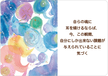 | 9 | ![]() | 自らの魂に耳を傾けるならば、今、この瞬間、自分にしか出来ない課題が与えられていることに気づく | 『日々の指針2』 ——宇宙とともに進化する (西園寺昌美) |