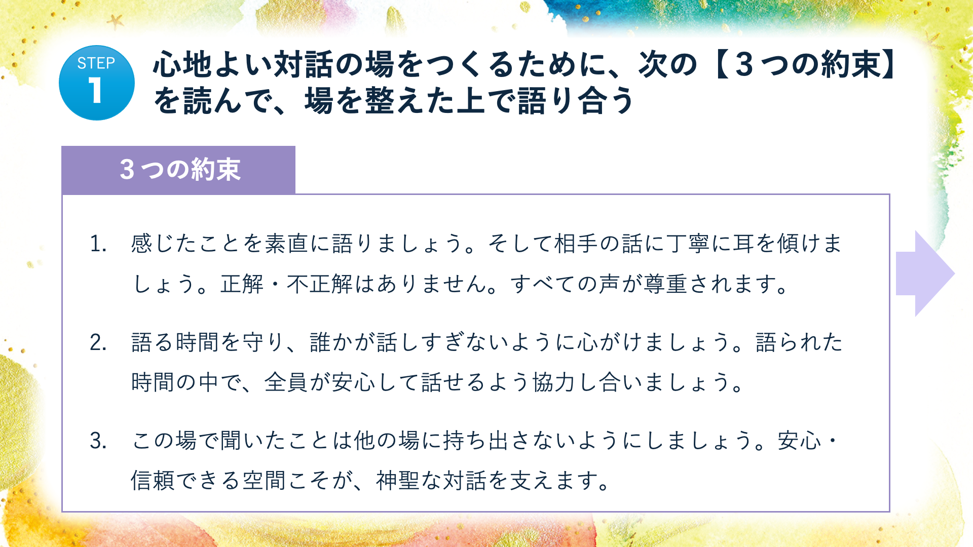 - 3.1.1. 心地よい対話の場をつくるために、次の【3つの約束】を読んで、場を整えた上で語り合う