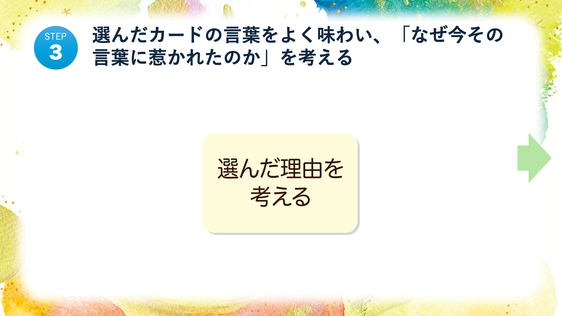 - 3.1.6. 選んだカードの言葉をよく味わい、「なぜ今その言葉に惹かれたのか」を考える